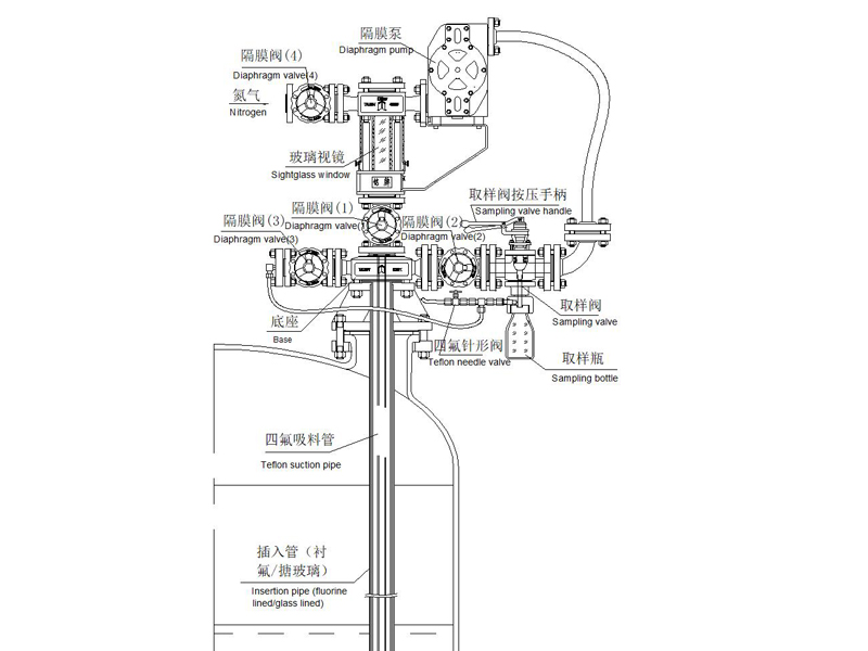 太極反應(yīng)釜在線自動(dòng)取樣系統(tǒng)(AUTOMATIC SAMPLING SYSTEM)為防腐在線取樣裝置。取樣物料接觸各部件均采用里襯PFA、襯氟材質(zhì),達(dá)到防腐目的;四氟吸料管配套插入管(襯氟/搪玻璃材質(zhì))浸于釜內(nèi)料液以下,增加其過程的穩(wěn)定性。隔膜泵以潔凈壓縮空氣為動(dòng)力,物料在取樣系統(tǒng)中形成閉環(huán)循環(huán)回路,過程快捷、安全、無污染。